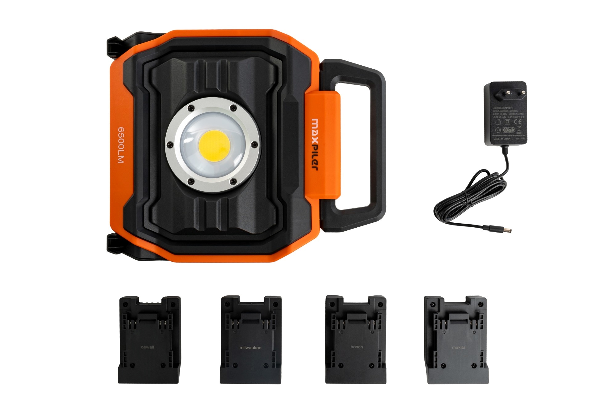 Фонарь, блок питания, кабель питания, адаптеры аккумуляторов (4 шт. - Бош, Милуоки, Деволт, Макита), руководство по эксплуатации, коробка