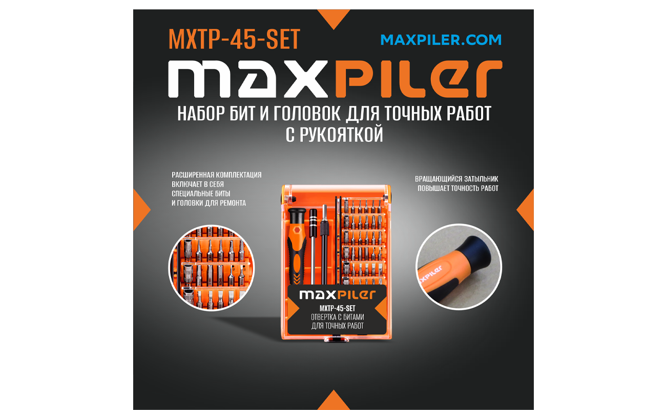 Набор бит для точных работ с рукояткой MAXPILER MXTP-45-SET отлично подойдет для работ с крепежом различных типов маленького и среднего размера. Входящие в состав набора торцевые головки позволяют работать также и с резьбовыми соединениями Магнитный удлиненный держатель обеспечивает надежную фиксацию бит, а гибкий удлинитель позволит добраться до крепежа в самых труднодоступных местах. Эргономичная двухкомпонентная рукоятка для комфортной работы. Удобный пластиковый кейс с прозрачной крышкой для удобства хранения и транспортировки.