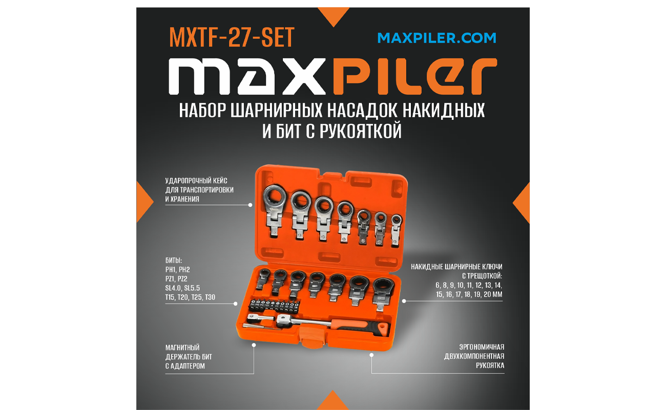 Набор шарнирных насадок накидных и бит с рукояткой MAXPILER MXTF-27-SET отлично подойдет для работ с крепежом различных типов. Входящие в состав набора шарнирные накидные насадки-ключи с трещоткой позволят работать с резьбовыми соединениями и добраться до крепежа в труднодоступных местах. Магнитный держатель обеспечивает надежную фиксацию бит. Эргономичная двухкомпонентная рукоятка для комфортной работы. Удобный пластиковый кейс для удобства хранения и транспортировки.
